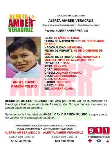 El programa Alerta Ámber Veracruz, solicita su colaboración para la búsqueda del niño Ángel David Ramón Pulido de 09 años de edad.