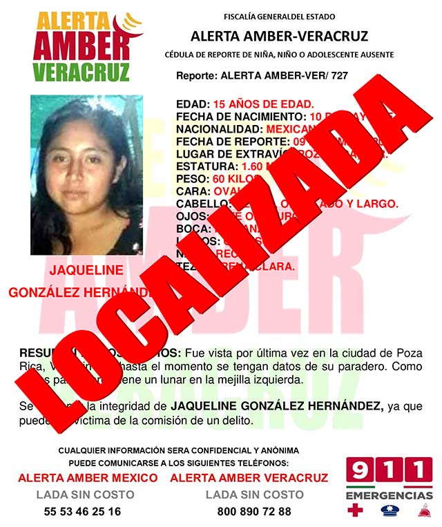 El programa Alerta Ámber Veracruz, solicita su colaboración para la desactivación de la Alerta por la adolescente, Jaqueline González Hernández de 15 años de edad, que ya fue localizada.