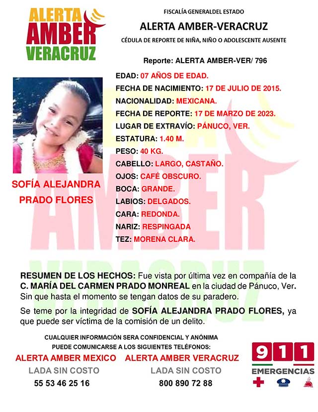 El programa Alerta Amber Veracruz, solicita su colaboración para la ACTIVACIÓN de la Alerta Amber-VER 796 por la niña SOFIA ALEJANDRA PRADO FLORES de 07 años de edad.
