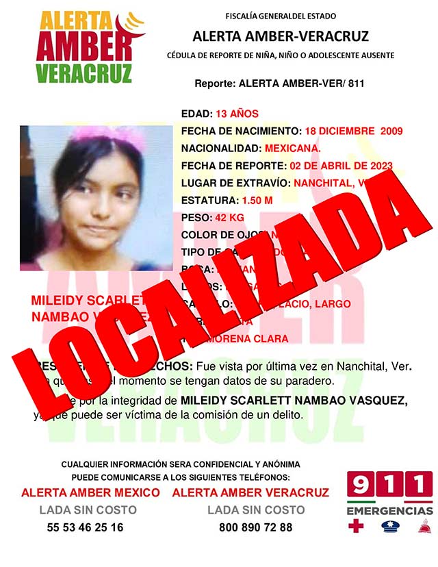 El programa Alerta Amber Veracruz, solicita su colaboración para la DESACTIVACIÓN de la Alerta Amber-VER 811 por la adolescente MILEIDY SCARLETT NAMBAO VASQUEZ, de 13 años de edad.