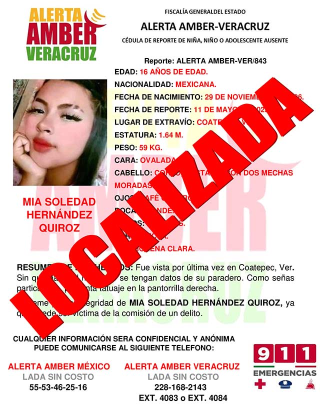 El programa Alerta Amber Veracruz, solicita su colaboración para la DESACTIVACIÓN de la Alerta Amber-VER 843 por la adolescente MIA SOLEDAD HERNÁNDEZ QUIROZ, de 16 años de edad.