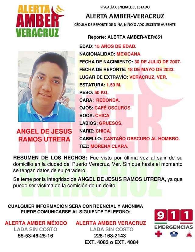 El programa Alerta Amber Veracruz, solicita su colaboración para la ACTIVACIÓN de la Alerta Amber-VER 850 por el adolescente ANGEL DE JESUS RAMOS UTRERA, de 15 años de edad.