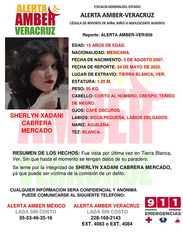El programa Alerta Ámber Veracruz, solicita su colaboración para la búsqueda de la adolescente Sherlyn Xadani Cabrera Mercado, de 15 años de edad.