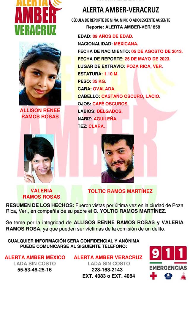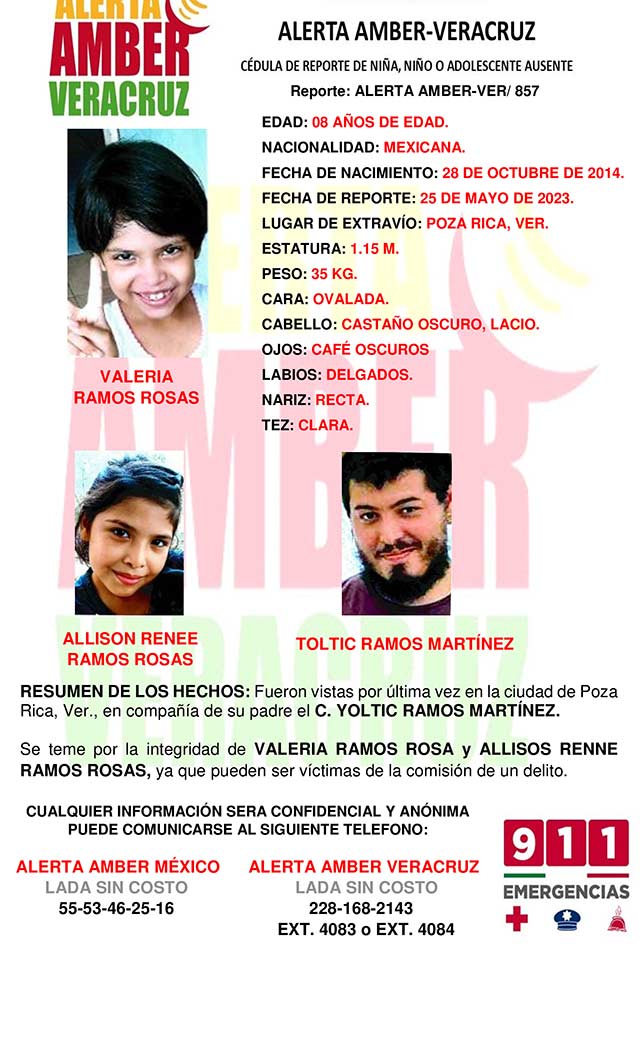 El programa Alerta Amber Veracruz, solicita su colaboración para la ACTIVACIÓN de las Alertas Amber-VER 857 y 858 por la adolescente VALERIA RAMOS ROSA y ALLISOS RENNE RAMOS ROSAS.