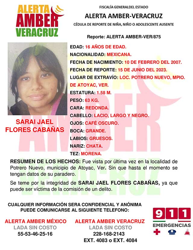 El programa Alerta Ámber Veracruz, solicita su colaboración para la búsqueda de la adolescente Sarai Jael Flores Cabañas, de 16 años de edad.