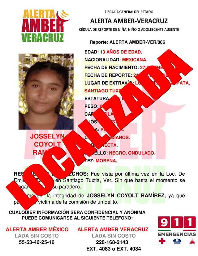El programa Alerta Amber Veracruz, solicita su colaboración para laDESACTIVACIÓN de la Alerta Amber-VER 886 por la adolescente JOSSELYN COYOLT RAMIREZ, de 13 años de edad.