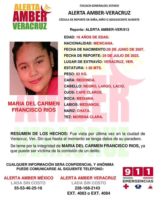 El programa Alerta Amber Veracruz, solicita su colaboración para la activación de la Alerta Amber-VER 913 por la adolescente Maria del Carmen Francisco Rios, de 16 años
