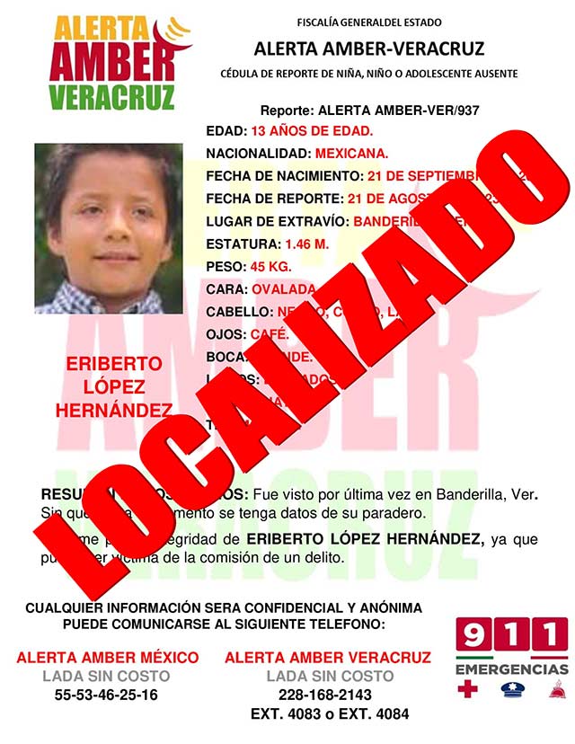 La Coordinación Estatal del Programa AAMBER-VER, informa la desactivación de la Alerta Amber-VER 937 por el adolescente Eriberto López Hernández de 13 años de edad.