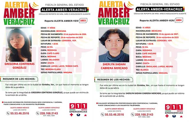 El programa Alerta Amber Veracruz, solicita su colaboración para la ACTIVACIÓN de la Alerta Amber-VER 1003 por la adolescente GREGORIA CONTRERAS GONZÁLEZ DE 17 AÑOS y 1004 por la adolescente SHERLYN XADANI CABRERA MERCADO, 16 AÑOS DE EDAD.