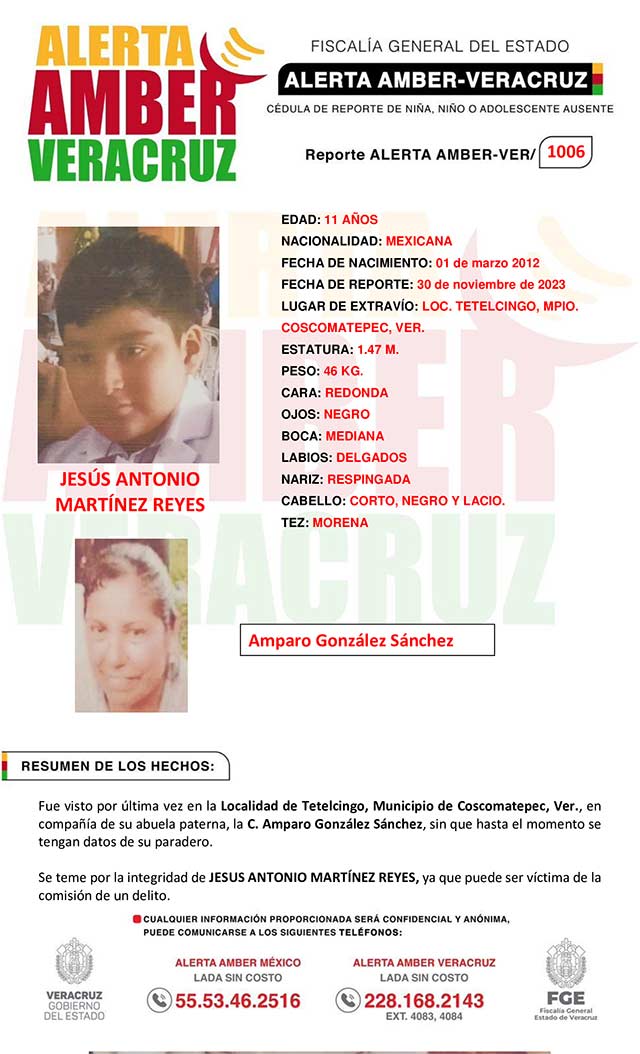 El programa Alerta Amber Veracruz, solicita su colaboración para la ACTIVACIÓN de la Alerta Amber-VER Alerta 1006 por el niño JESÚS ANTONIO MARTÍNEZ REYES, de 11 años de edad.