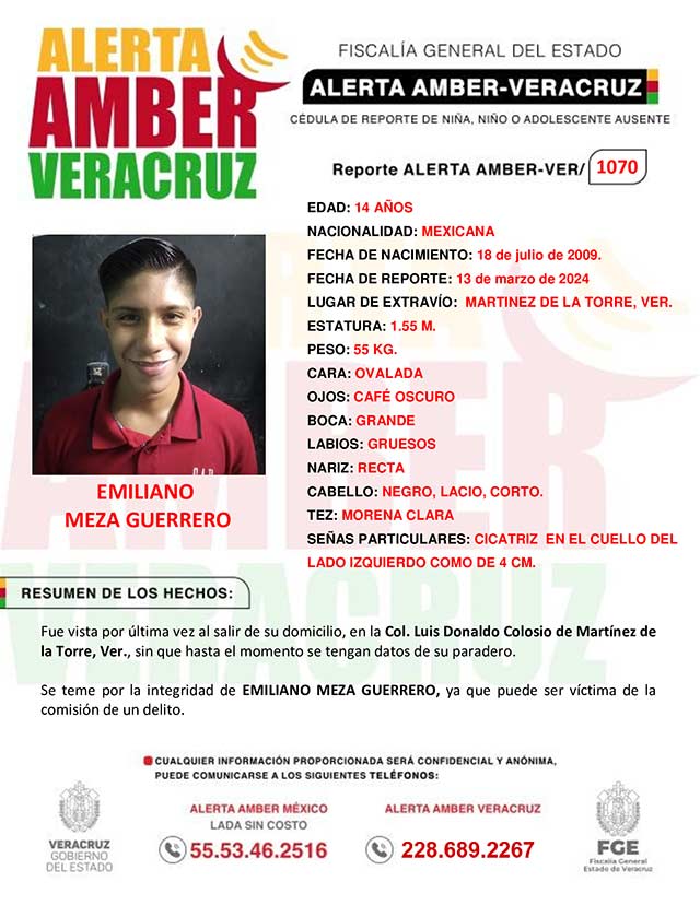 El programa Alerta Amber Veracruz, solicita su colaboración para la ACTIVACIÓN de la Alerta Amber-VER 1070 por el adolescente Emiliano Meza Guerrero, de 14 años.