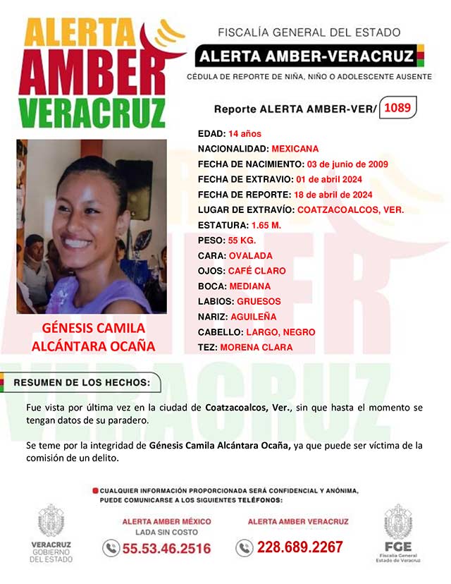 ​El programa Alerta Amber Veracruz, solicita su colaboración para la Activación de la Alerta Amber-VER 1089 por la adolescente GENESIS CAMILA ALCANTARA OCAÑA, de 14 años
