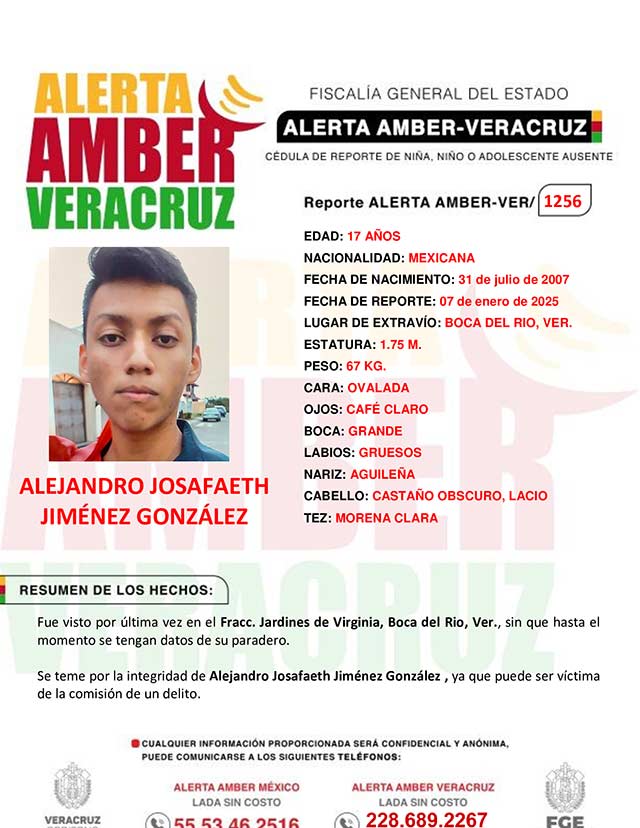 El programa Alerta Amber Veracruz, solicita su colaboración para la activación de la Alerta Amber-VER 1256 por el adolescente Alejandro Josafaeth Jiménez González, de 17 años.
