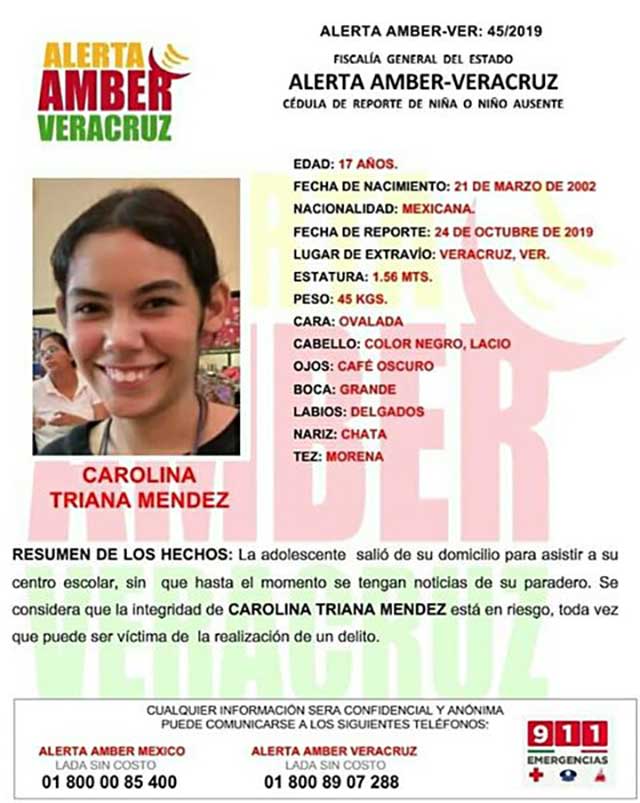 El programa Alerta Amber solicita su colaboración para la difusión de la Alerta Amber-Ver 45/2019 activada para coadyuvar en la búsqueda de Carolina Triana Méndez, de 17 años de edad, originaria de Veracruz, Ver.