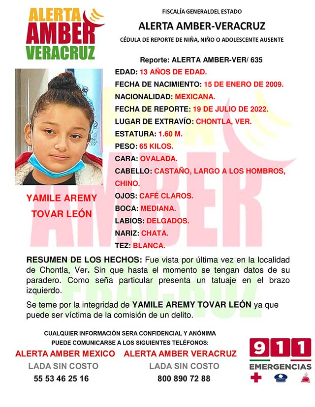 Se solicita su colaboración para localizar a la adolescenteYAMILE AREMY TOVAR LEON, de 13 años de edad. Se considera que la integridad de laadolescente
