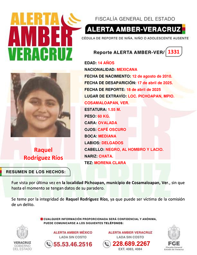 Activación de la Alerta Amber 1331 de la adolescente Raquel Rodríguez Ríos