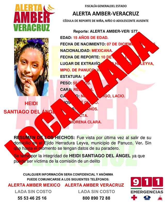 El programa Alerta Amber Veracruz, solicita su colaboración para la desactivación de la cédula ALERTA AMBER-VER 577 por la adolescente Heidi Santiago del Ángel, de 15 años de edad, por haber sido localizada.