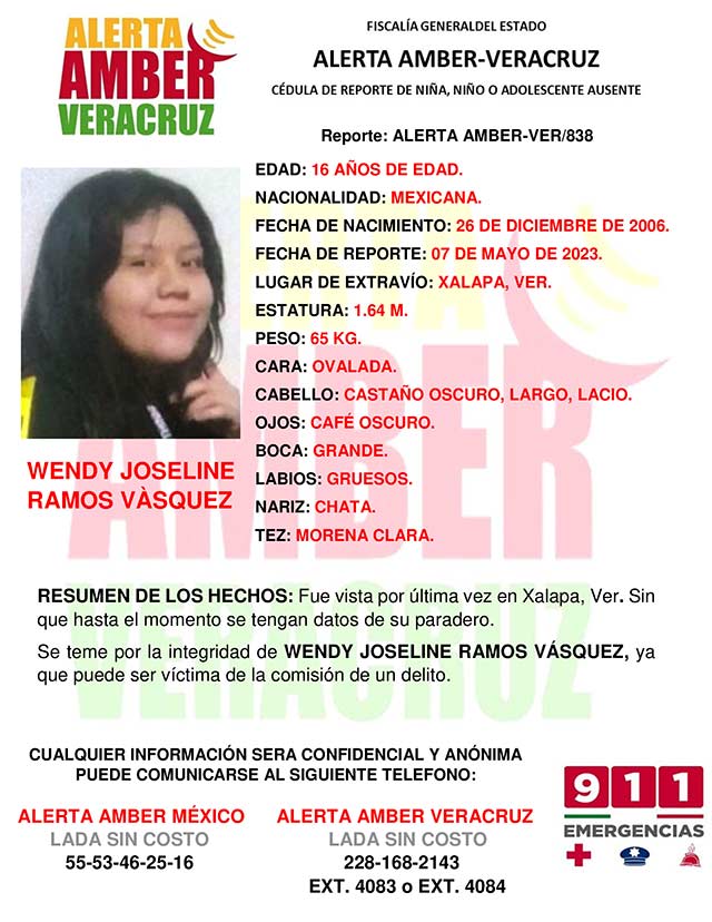 El programa Alerta Amber Veracruz solicita su colaboración para la activación de la Alerta Amber-Ver. 838, por la adolescente WENDY JOSELINE RAMOS VÁSQUEZ, de 16 años de edad.