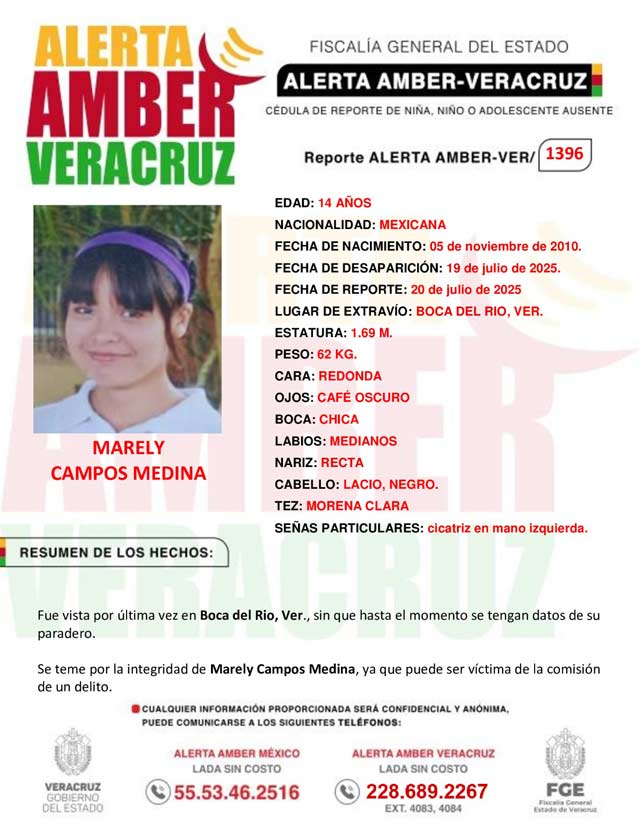 ALERTA AMBER- VERACRUZ 1396 por la adolescente Marely Campos Medina, de 14 años de edad.