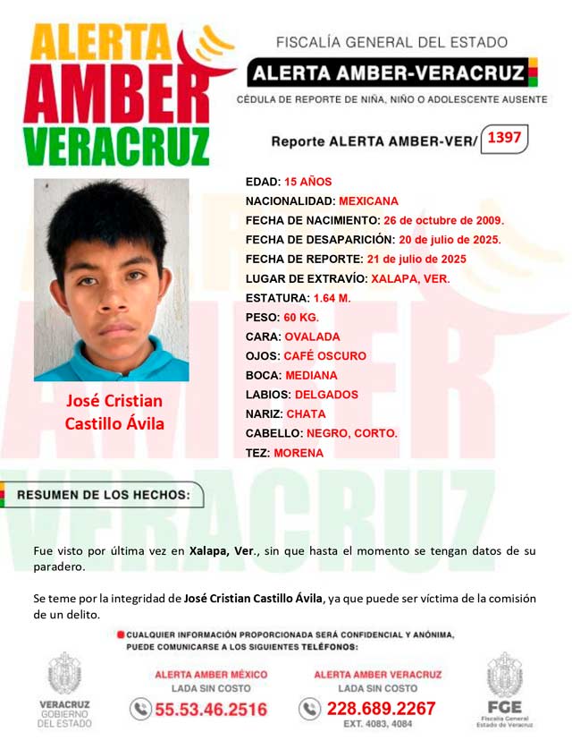 ALERTA AMBER- VERACRUZ 1397 por el adolescente José Cristian Castillo Ávila , de 15 años de edad.