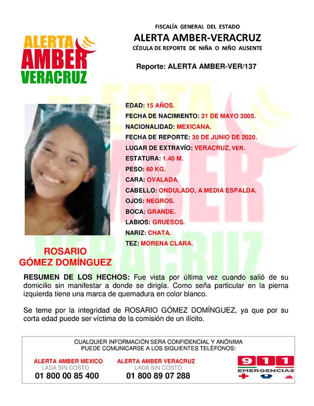 El programa Alerta Amber Veracruz, solicita su colaboración para difundir la cédula ALERTA AMBER-VER 137 para la búsqueda de ROSARIO GÓMEZ DOMÍNGUEZ, de 15 años de edad de quien se desconocen datos sobre su paradero.
