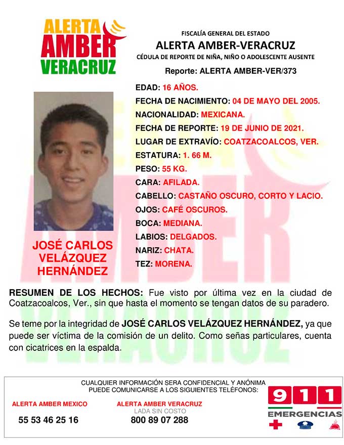 El programa Alerta Amber Veracruz, solicita su colaboración para la difusión de la cédula ALERTA AMBER-VER 373 para la búsqueda del adolescente JOSÉ CARLOS VELÁZQUEZ HERNÁNDEZ, DE 16 AÑOS DE EDAD