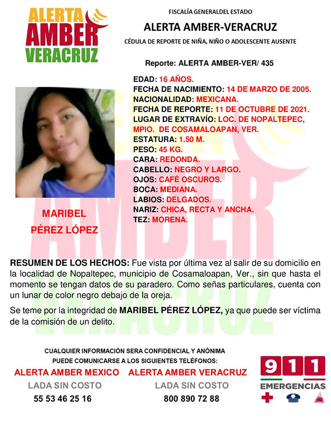 El programa Alerta Amber Veracruz, solicita su colaboración para la activación de la cédula ALERTA AMBER-VER 435 para la búsqueda de la adolescente MARIBEL PÉREZ LÓPEZ de 16 años de edad.