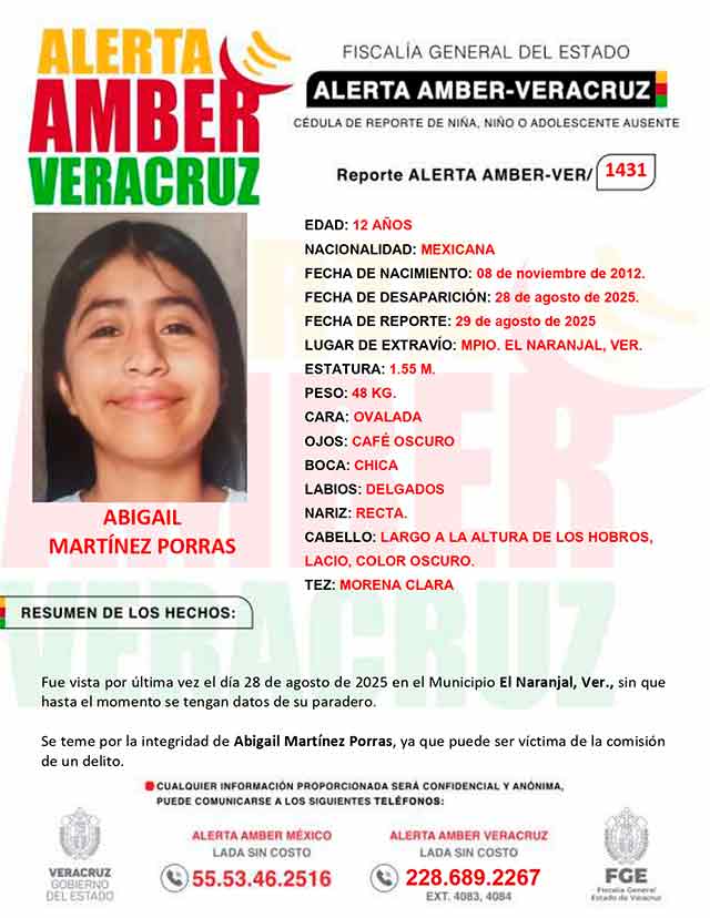 El programa Alerta Amber Veracruz, agradece su colaboración e informa la ACTIVACIÓN de la ALERTA AMBER- VERACRUZ 1431 por la adolescente Abigail Martinez Porras de 12 años de edad.