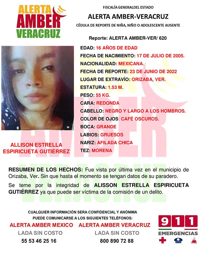 El programa Alerta Amber Veracruz solicita su colaboración para la activación de la cédula ALERTA AMBER-VER 620, para la búsqueda de la adolescente ALLISON ESTRELLA ESPIRICUETA GUTIÉRREZ, de 16 años de edad.
