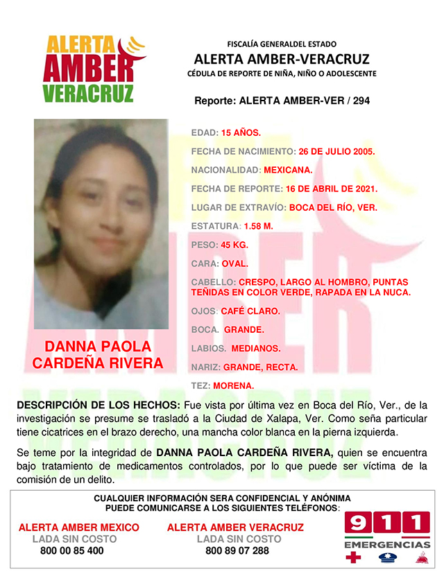 El programa Alerta Amber Veracruz solicita su colaboración para la difusión de la cédula ALERTA AMBER-VER 294 para la búsqueda de Danna Paola Cardenas Rivera, de 15 años de edad.