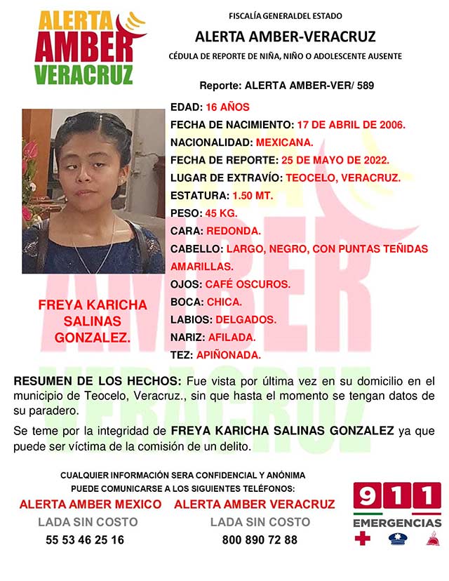 El programa Alerta Amber Veracruz, solicita su colaboración para la activación de la cédula Alerta Amber-Ver 589, para la búsqueda de la adolescente KARICHA SALINAS GONZALEZ, de16 años de edad.