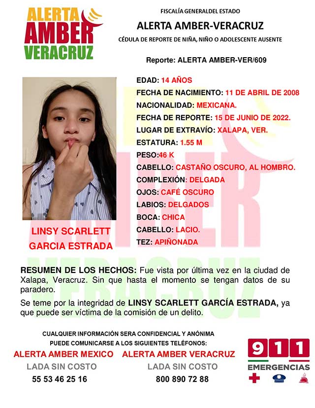 El programa Alerta Amber Veracruz, solicita su colaboración para la búsqueda de la adolescente Linsy Scarlett García Estrada, de 14 años de edad. Se considera que su integridad puede estar en riesgo.