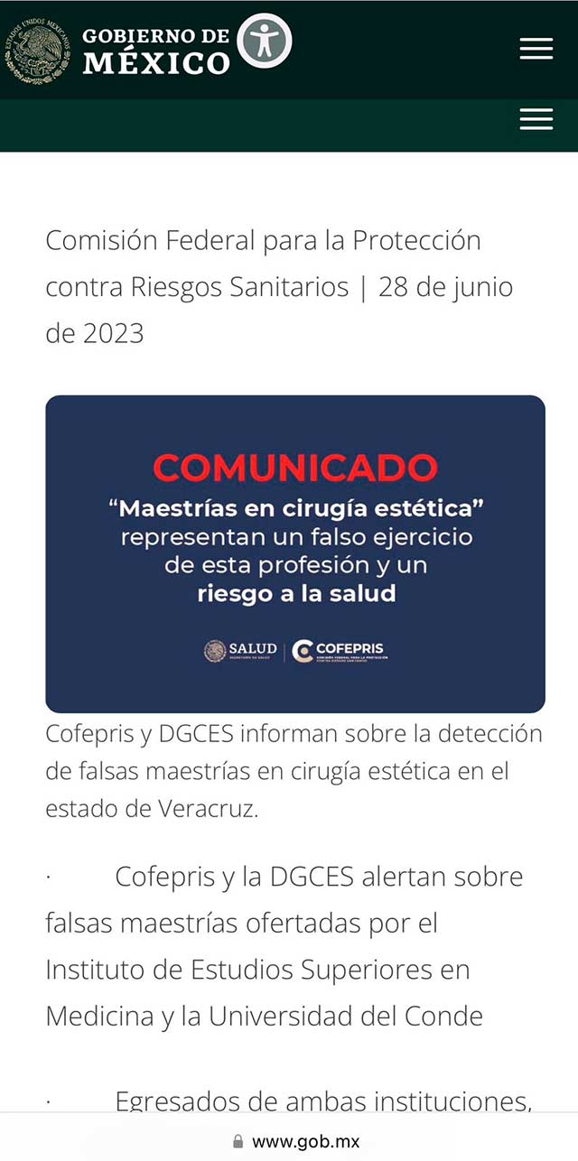 La Comisión Federal para la Protección contra Riesgos Sanitarios (COFEPRIS) y la Dirección General de Calidad y Educación en Salud (DGCES) acusaron al Instituto de Estudios Superiores en Medicina (IESM), ubicado en el centro de Xalapa, y a la Universidad del Conde, situada en la carretera antigua a Coatepec, de ofertar “falsas maestrías” en cirugía estética y longevidad.