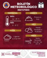 Respecto a las temperaturas, detalló que en la Capital del Estado se han registrado valores que oscilan entre los 12 y los 9 grados Celsius, y se prevé que el ambiente sea un poco más frío en las próximas horas.