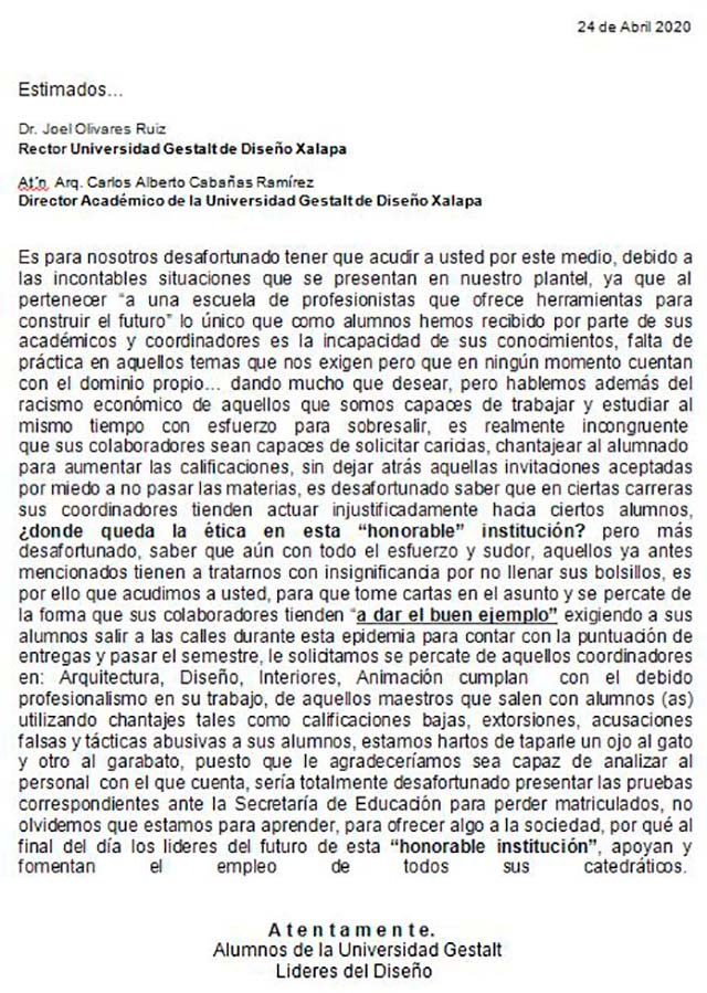 Alumnos de diversas carreras de la Universidad Gestalt de Diseño expusieron, en una carta, las situaciones irregulares de personal académico de esta institución hacia estudiantes y solicitan al Rector y al Director Académico dar solución a esta situación.