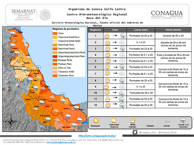 La circulación anticiclónica extendida sobre el Golfo de México, así como el desplazamiento de la Onda Tropical Número 27 por el sur del país, se espera mantengan la generación de los nublados con potencial para intervalos de chubascos (5.1 a 25 mm) con posibles tormentas puntuales fuertes (25 a 50 mm) en partes altas, desde la cuenca del río Pánuco hasta el Cotaxtla; además de cuencas de los ríos Papaloapan, Coatzacoalcos y Tonalá, donde puede presentarse algún evento puntal ligeramente mayor. En el resto de la región veracruzana se esperan intervalos de chubascos (5.1 a 25 mm) de manera puntual, lluvias escasas o lloviznas (0.1 a 5 mm) dispersas en zonas de costa del centro y norte del Estado de Veracruz y en las cuencas de los ríos Soto La Marina, Sierra Madre, Guayalejo-Tamesí y Tamuín, en Tamaulipas. Las lluvias pueden ser vespertinas a nocturnas en regiones montañosas y nocturnas a matutinas en planicies y costas acompañadas de actividad eléctrica y viento en rachas.