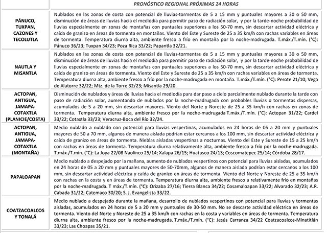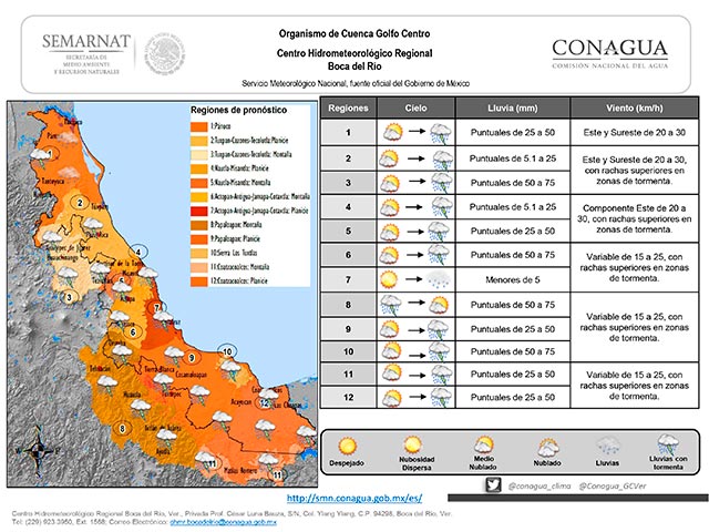 La persistencia de una vaguada en el suroeste del Golfo de México en combinación con un patrón de vientos divergentes en la atmósfera superior mantendrá las condiciones de cielo nublado a medio nublado en el estado de Veracruz durante este día, favoreciendo probabilidad de lluvias esta mañana en la zona norte y costa central, los cuales se espera disminuyan hacia el mediodía y se desarrollen en horas de la tarde-noche en las regiones de montaña y porción sur, en estas regiones podrían ser localmente fuertes y podrían acompañarse de actividad eléctrica, ráfagas de viento y probabilidad de caída de granizo en zonas serranas. Se recomienda consultar las actualizaciones del pronóstico del tiempo.
