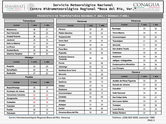 Cielo despejado a medio nublado se aprecia a lo largo de la región de pronóstico, como resultado de la entrada de aire marítimo tropical y el débil canal de baja presión al suroeste del Golfo de México. El viento se mantiene fluyendo del Noreste con velocidades de 10 a 20 km/h. Esta mañana la temperatura favorece ambiente templado en zonas montañosas, y cálido en planicies y costas.
