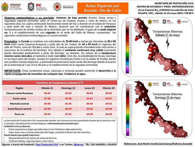 Será un sábado con tiempo estable con temperaturas muy altas en Veracruz, con máximas de 28 a 38°C en montañas; 34 a 40°C en costas y 38 a 45°C en planicie; sensación de bochorno de 40-49°C o superior. Viento del Noreste, Este y Sureste de 20-30 kilómetros por hora, evento de surada con rachas de 55-80 kilómetros por hora del Papaloapan al Tonalá, especialmente en Los Tuxtlas. Probabilidad baja a nula de precipitaciones, aunque en zonas de montañas límites con Hidalgo y Puebla pueden ocurrir aisladas, además tenderá a aumentar el domingo en cuentas del norte y montañas con eventos aislados de lluvias y tormentas.