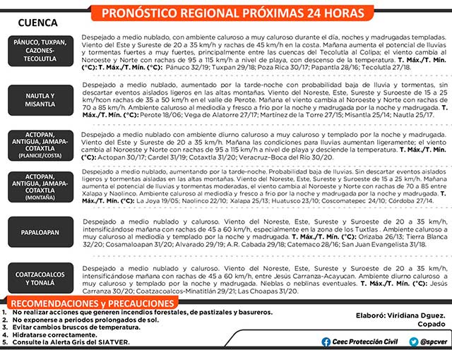 Se prevé un ambiente caluroso a muy caluroso, con baja probabilidad de precipitaciones y una Surada moderada a fuerte. Para mañana, se anticipa un incremento en el potencial de lluvias y tormentas, las cuales pudieran ser fuertes a muy fuertes, acompañado del desarrollo de un Norte fuerte con rachas violentas y una disminución en la temperatura, situación asociada con el Frente Frío No. 41 y masa ártica. Consultar la Alerta Gris del SIATVER en fase de Acción.