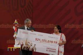 El presidente Andrés Manuel López Obrador entregó cheques por más de 21 millones de pesos a cada uno de los municipios de Metlatónoc y Cochoapa El Grande, los más pobres de la montaña de Guerrero, dinero que resultó de las subastas de casas e inmuebles decomisados a la delincuencia.