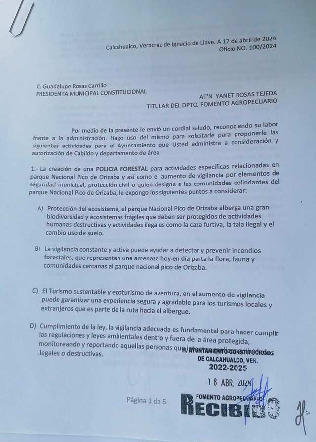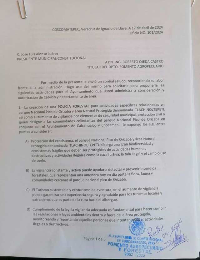 Por este medio señalamos que continúa la tala en el Parque Nacional Pico de Orizaba y se entregó oficio a los ayuntamientos de Calcahualco y Coscomatepec para la creación de Policía Forestal. Tenemos 2 áreas protegidas y la tala ilegal continúa. Pedimos a las autoridades correspondientes dar solución a esto, muchas gracias.