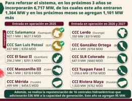 Durante su participación en “la mañanera del pueblo”, la funcionaria detalló que entre 2025 y 2027 se sumarán 6,717 megawatts (MW) a la capacidad instalada del país, de los cuales 1,364 MW ya están en operación este año y otros 1,101 MW entrarán en los próximos meses.