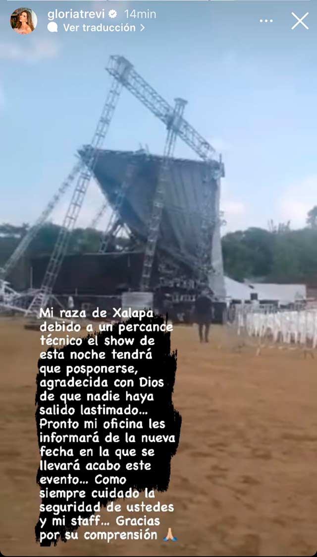 A través de una transmisión en vivo en redes sociales, la cantante Gloria Trevi arrancó con un profundo suspiro al decir que este sábado había sido un día muy muy intenso y confirmó que aunque el escenario montado en el estadio de beisbol de la USBI Xalapa se haya caído, la noche de este sábado sí se llevará a cabo su concierto aunque “con un show alternativo”.