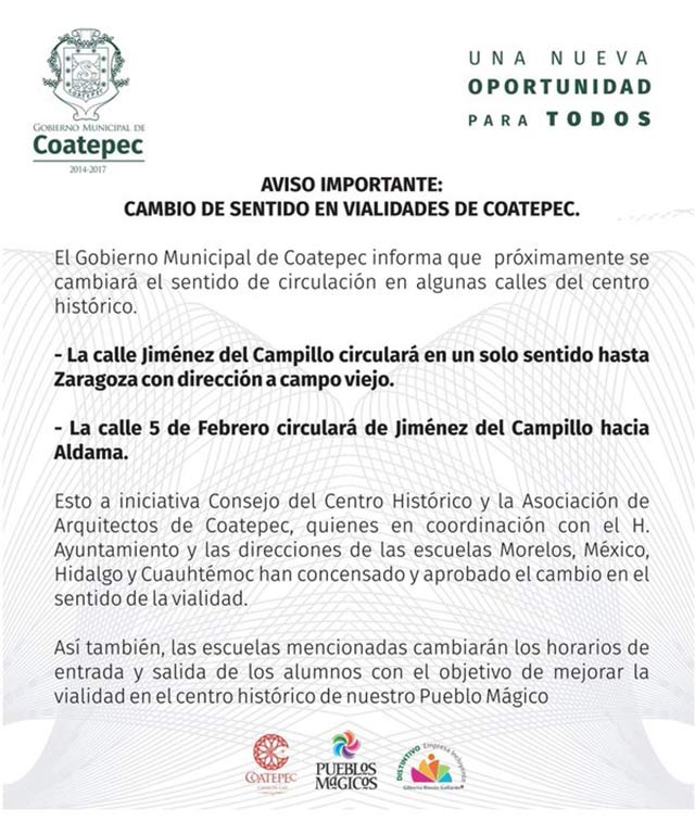 Anuncian cambios de vialidades en calles del centro de Coatepec, próximamente