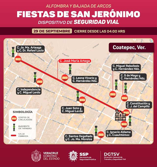 Coatepec, Ver., 28 de septiembre de 2023.- Con motivo de las festividades de San Jerónimo, Tránsito del Estado implementará dispositivo de seguridad vial en las principales calles del Centro, se llevarán a cabo cierres a la circulación desde este viernes a las 4:00 horas, concluyendo el 1 de octubre.