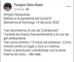 A través de una publicación en redes sociales, los locatarios solicitaron a sus clientes usar cubrebocas, portar gel antibacterial y respetar la distancia mínima de entre 1.5 a 3 metros por persona.