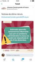 “Estimado aprendiz, lamentamos informarte que por un problema administrativo tu beca no podrá ser depositada el día 13 de diciembre”, fue el mensaje publicado a traves de esa red social.