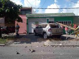 Por el fuerte golpe la camioneta terminó arriba de la banqueta, estrellándose contra la fachada de una vivienda y dañando un poste de concreto; mientras que el camión terminó por derribarlo.
