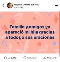 “Familia y amigos ya apareció mi hija, gracias a todos por sus oraciones”, escribió en redes sociales Ángeles Gómez, madre de la universitaria.